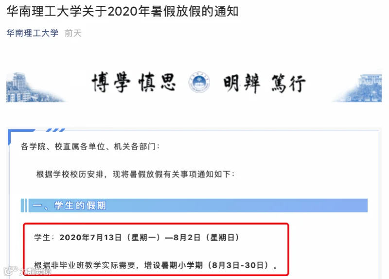7月11日,华南理工大学官方公众号发布《华南理工大学关于2020年暑假放假的通知》,明确