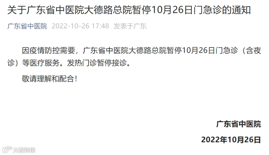 广东省中医院大德路总院暂停10月26日门急诊