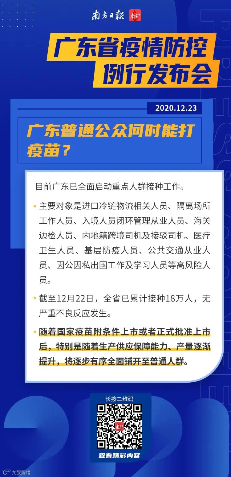 针对南沙出现的疫情,段宇飞介绍,广东及早落实核酸检测、人群排查管理、重点区域管控等各项防控处置措施,截至12月23日12时,无新增本地感染个案报告。该起疫情得到了及时有效的控制,疫情传播扩散风险小。总的来说,当前广东疫情总体保持平稳,全省均属于低风险地区。