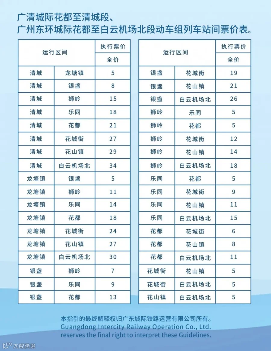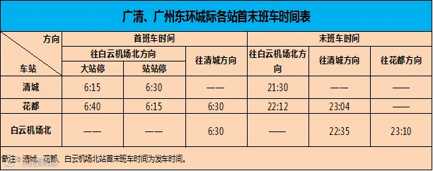 广东城际铁路运营有限公司表示,广清城际、广州东环城际将采用“清城-花都-白云机场北”贯通运营。每天6:15清城站往白云机场北站方向开行1列大站停列车(中间站仅停花都站),其余列车均采用站站停方式。清城站至花都站大站停单程旅行时间约16分钟,站站停旅行时间约33分钟;花都站至白云机场北站大站停单程旅行时间约14分钟,站站停旅行时间约21分钟。