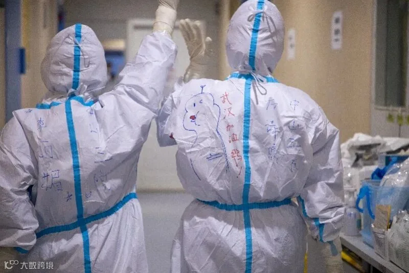 2020年3月4日下午,湖北武汉协和西院,两位来自广州中山一院的医生在进入污染区病房前在隔离衣上写上我代表月亮消灭病毒的字样。南都记者 谭庆驹 摄