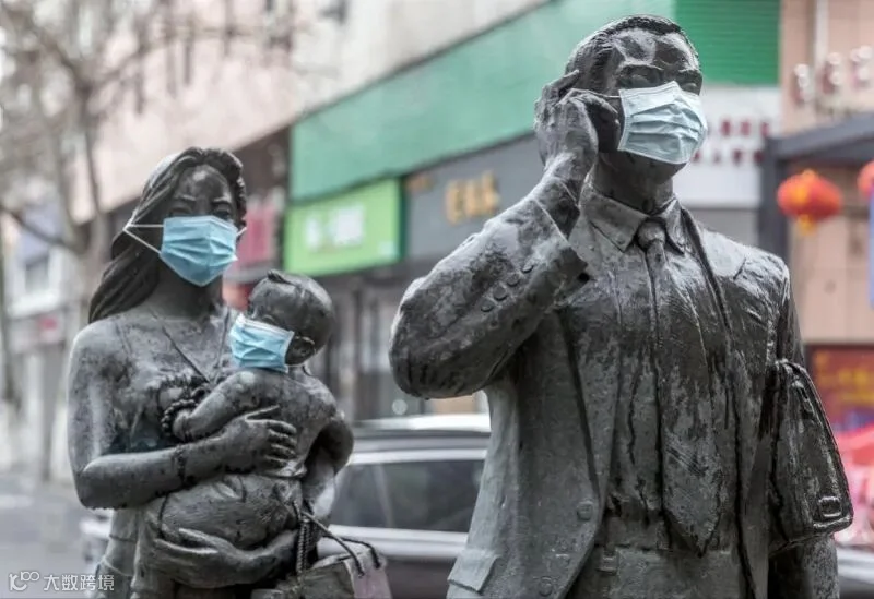 2020年2月27日,湖北武汉,寒潮袭来,香港路雕塑戴着口罩。当天,武汉下起了小雨,日间气温10℃左右。南都记者 谭庆驹 摄