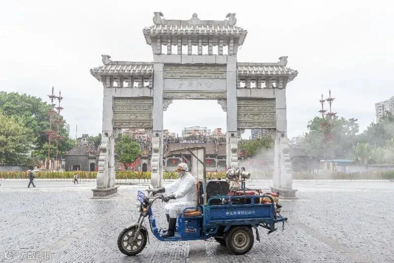 2020年2月4日下午,广州荔湾区金花街道消毒站的工作人员在陈家祠广场进行消杀。南都记者 谭庆驹 摄