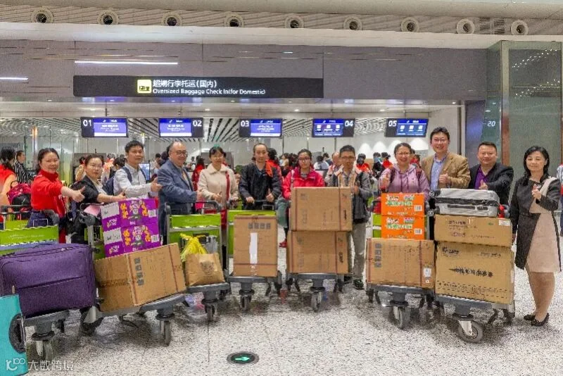 广州白云机场,广医一院援助湖北的首批医疗队队员出发前合影。2020年1月24日除夕夜晚,首批广东省援助湖北医疗队队员从广州白云机场出发。南都记者 谭庆驹 摄