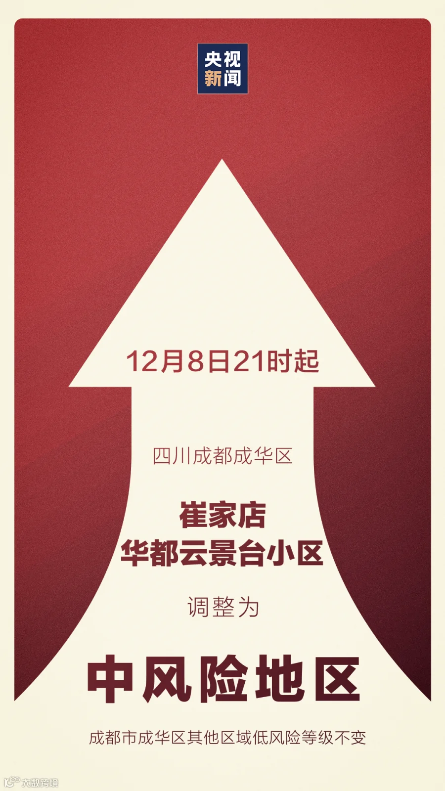 经成都市成华区新冠肺炎疫情防控指挥部研究决定:自12月8日21时起,将成都市成华区崔家店华都云景台小区的风险等级由低风险调整为中风险。成都市成华区其他区域低风险等级不变。