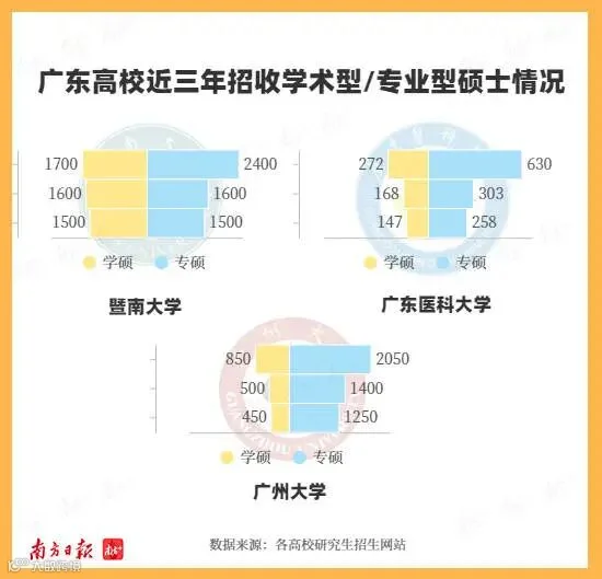各高校情况如何?统计招生章程发现,多所高校专硕人数比例不断提升。例如暨南大学2019-2020两年专硕与硕士学术学位研究生(下称“学硕”)人数一致,分别为1500人、1600人。2021年章程中提出,专硕计划招收2400人,比学硕多700人。广州大学专硕招生计划也显著增多,从2019年1250人、2020年1400人,明年计划增至2050人,超过总招生计划的70%。