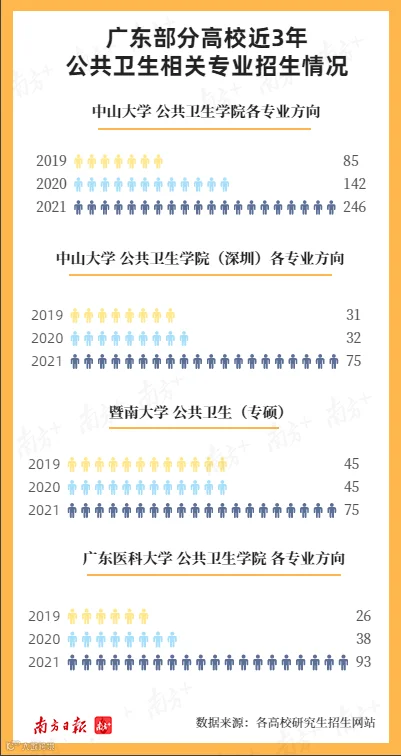 统计招生学科专业目录发现,2021年多所高校公共卫生相关专业正在不断扩招。例如中山大学公共卫生学院各专业方向共计划招生246人,比2020年扩招141人,翻倍增长;暨南大学公共卫生(专业学位)从45人提升2021年的75人。