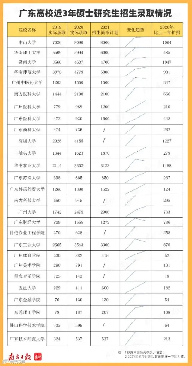 南方教育智库统计发现,2019年和2020年实际录取人数对比,广东27所高校全部扩招了。