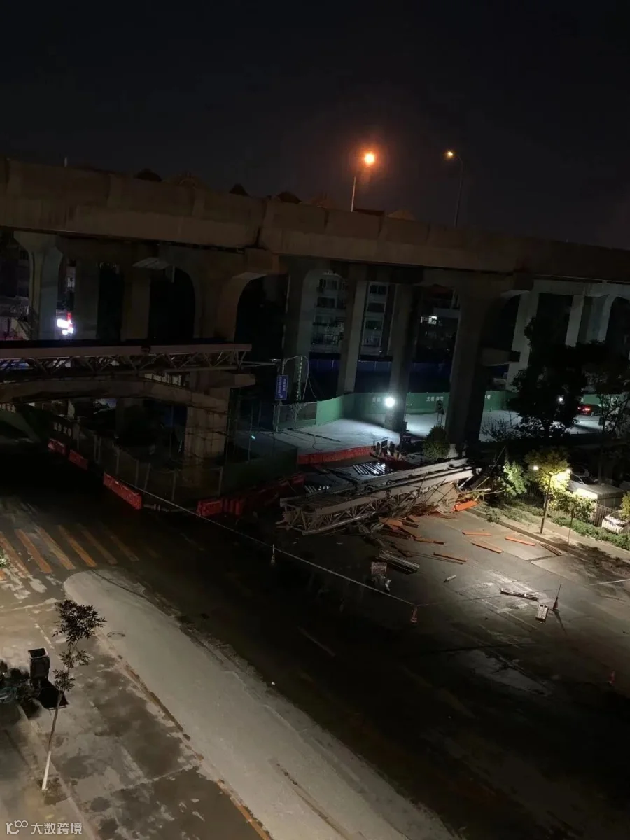 今天凌晨,住在洛湖居的居民纷纷表示自己被这声巨响惊醒。有居民通过自家窗户看到,洛溪大桥拓宽工程外侧的人行桥有一段坠落。