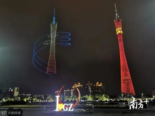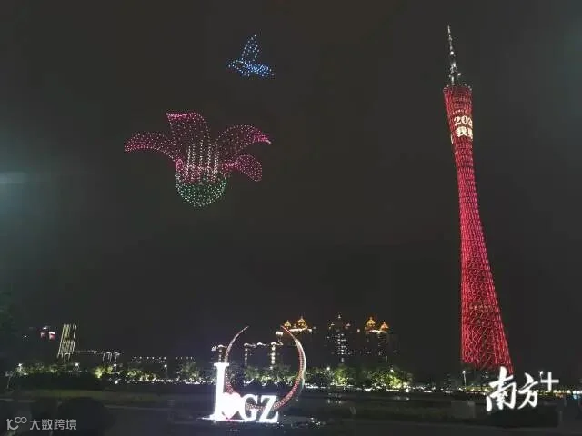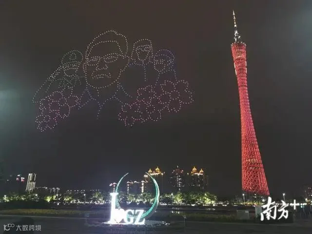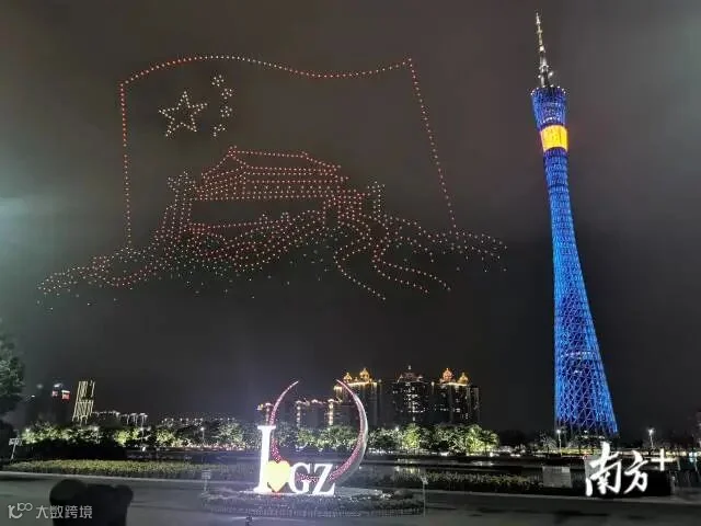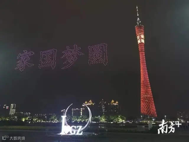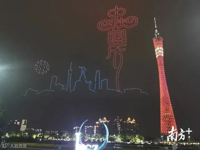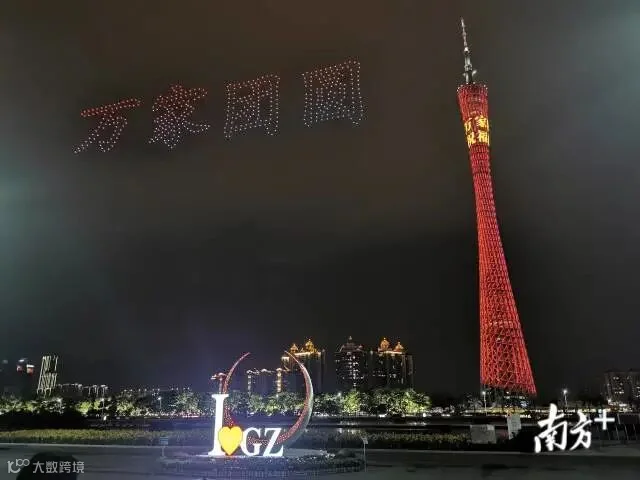 的代表“五羊”出现在小蛮腰旁的夜空中,广州的代表性建筑逐一呈现,无人机灯光造出以中国节为特色字体的中秋国庆,月亮也在空中缓缓升起!