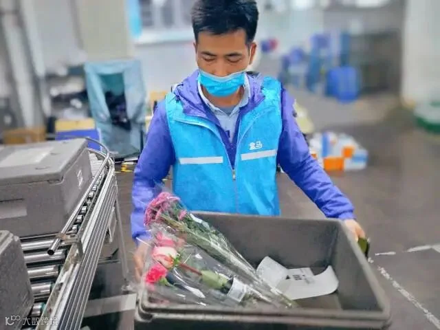 快递小哥送花到家,购买便利。