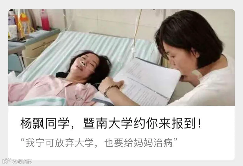 拿到通知书后,陈忠兰更加卖力地工作给杨飘攒大学的学费。而杨飘则利用起了自己的假期时间当家教,希望可以为母亲分忧。然而9月10日,作为家中顶梁柱的母亲陈忠兰却突发脑出血住进了沧州市中心医院的重症监护室。突然的变故、高昂的医药费、学费,甚至让对大学生活满心憧憬的她萌生了放弃读大学,留下来照顾妈妈的想法。