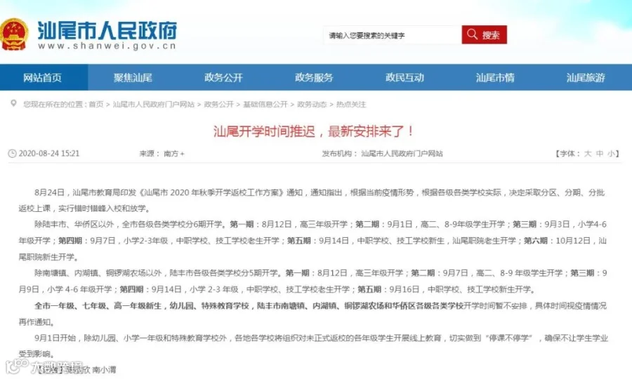 第五期:9月14日,中职学校、技工学校新生,汕尾职院老生开学;
