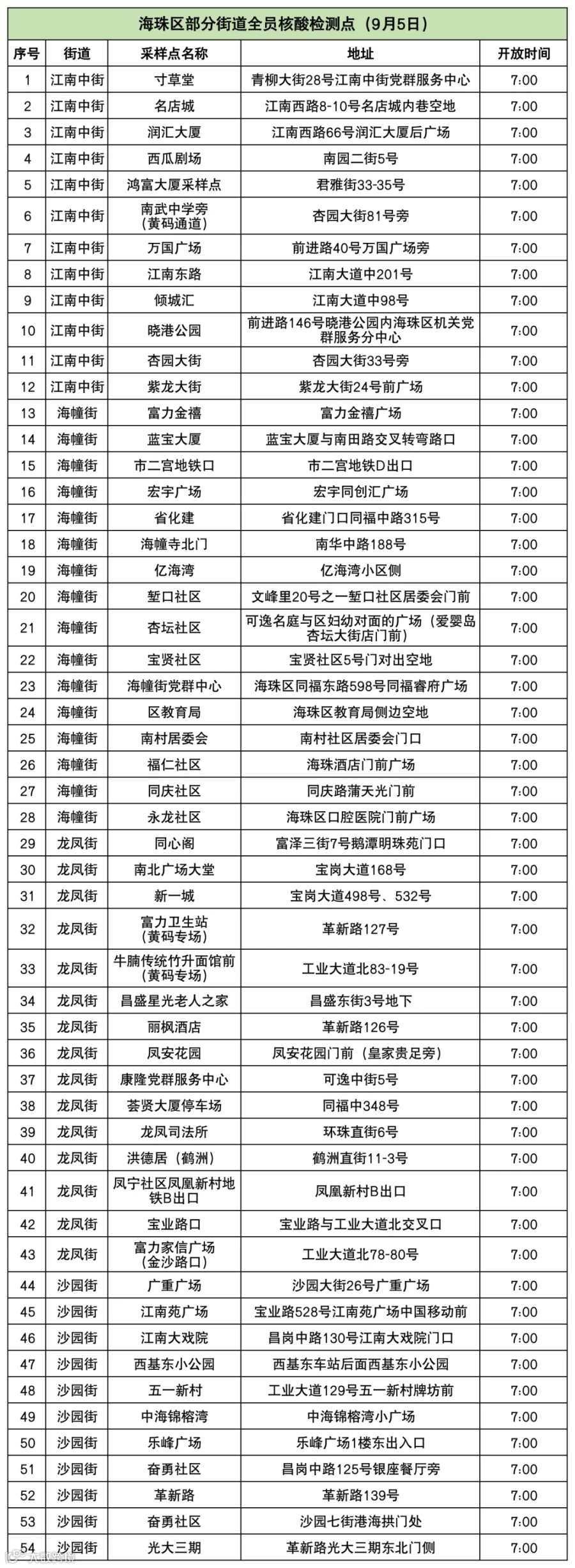 根据最新疫情防控形势,经区新型冠状病毒肺炎疫情防控指挥部研究决定,在常态化核酸检测的基础上,9月5日在江南中、海幢、龙凤、沙园等街道开展全员核酸筛查工作(点位开放时间详见附表)。现将有关事项通告如下: