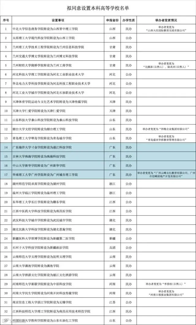 其中广东有4所独立学院拟转设,分别为: