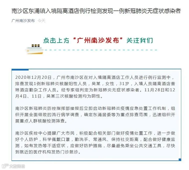 南沙发布”消息,2020年12月20日,广州市南沙区在对入境隔离酒店工作人员进行例行监测中,排查发现1例新冠肺炎核酸阳性人员,吴某,女性,31岁,入境人员隔离酒店普琳酒店勤杂工作人员。经专家组判定为新冠肺炎无症状感染者。11月28日和12月4日、11日,吴某三次核酸检测均为阴性。