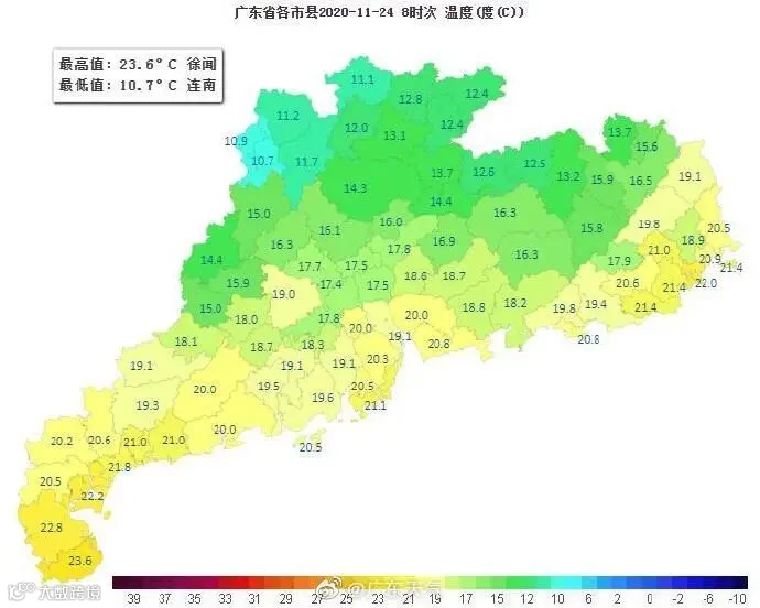 24日,粤北偏北地区、雷州半岛多云间阴天为主,其余大部分市县多云间晴天为主,最低气温,粤北、肇庆北部9℃~14℃,南部市县17℃~21℃,其余市县15℃~18℃;