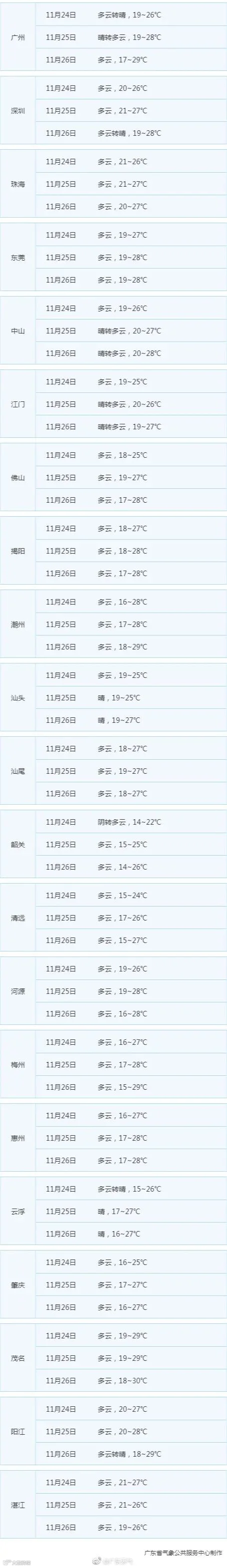 25到26日,全省大部晴到多云为主,最低气温,粤北、肇庆北部10℃~15℃,南部市县19℃~21℃,其余市县16℃~19℃。