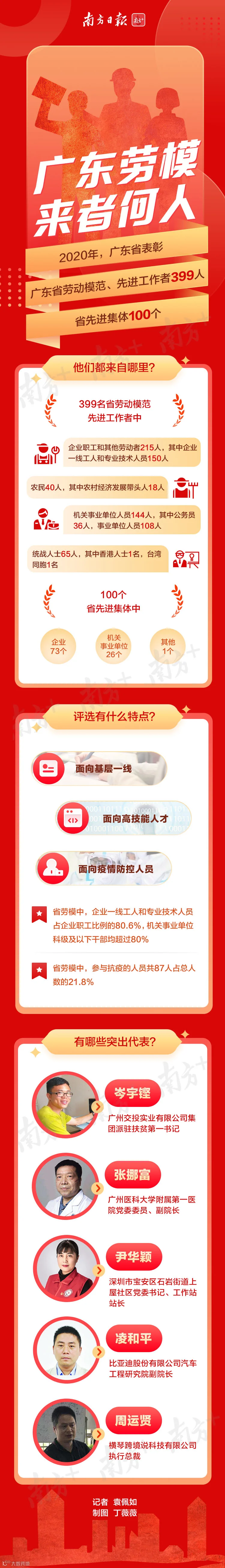 据悉,广东评选出399名省劳动模范、先进工作者人选中:企业职工和其他劳动者215人,其中企业一线工人和专业技术人员150人;农民40人,其中农村经济发展带头人18人;机关事业单位人员144人,其中公务员36人,事业单位人员108人;统战人士65人,其中香港人士1名,台湾同胞1名;中共党员240名;妇女96名;少数民族7名。推荐的100个省先进集体中,企业73个、机关事业单位26个、其他1个。