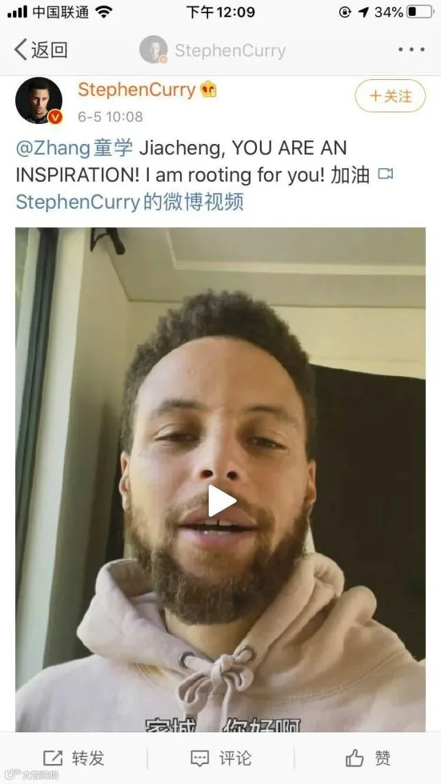 昨天,NBA球星史蒂芬·库里更是在微博发帖寻人。在微博中,史蒂芬·库里说,“这个孩子是谁?帮我找到他!坚持做你自己,并且不要让别人告诉你你不行。”随即引起众多网友关注,并登上微博热搜。