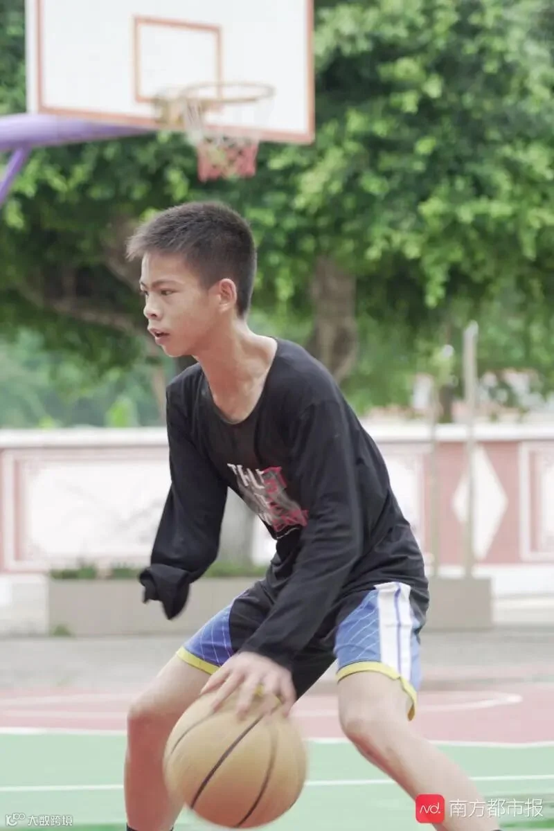 ,今年13岁。5岁时,因为一场意外,他失去了右臂。2018年,他第一次接触篮球并从此爱上。他向记者展示因打球出血后又结茧了的五只左手手指,笑言“每天不练球不舒服”。