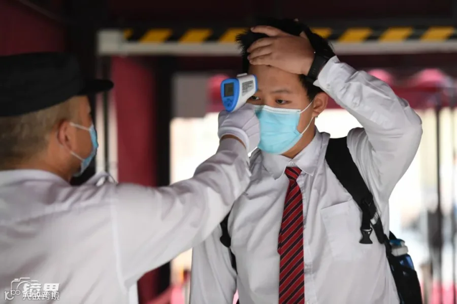 进校都必须测体温。深圳外国语学校初中部,一名初三学生入校时接受体温检测。(摄影/梁旭)▼