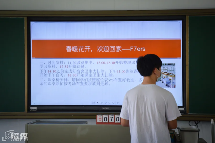 一名高三学生回到教室,一切还是那么熟悉,讲台上静静地标识着“距高考还有71天”。(摄影/吕芳)▼