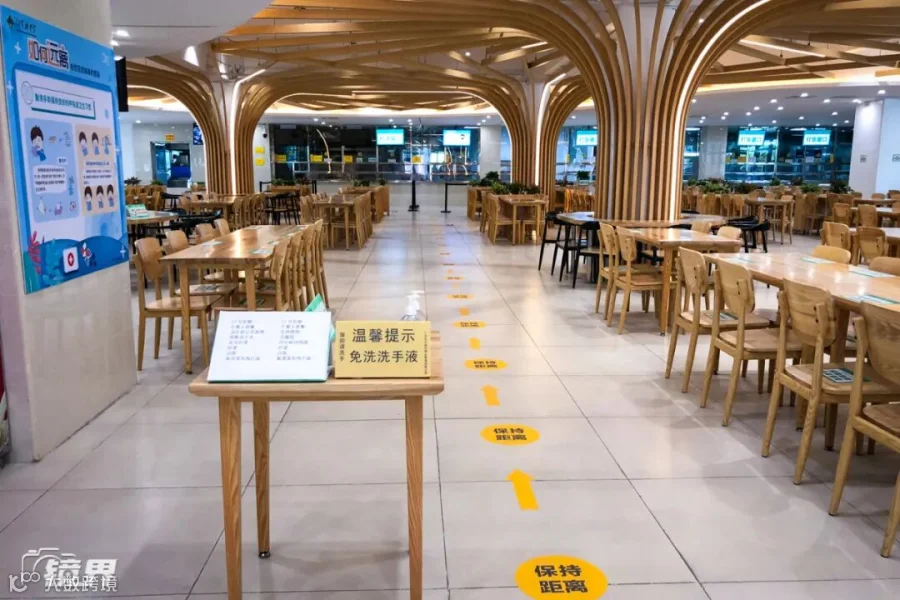 忙了一上午,接下来该吃午饭了。广东省实验中学食堂提供两种套餐供学生选择,每人一张桌子就餐,地面每隔一米标有一个“保持距离”。(摄影/吕芳)▼