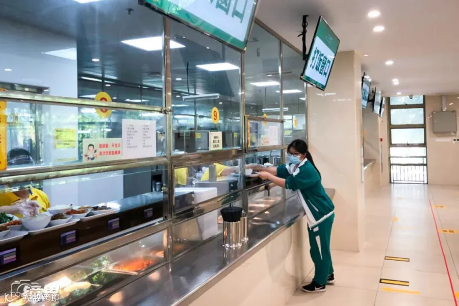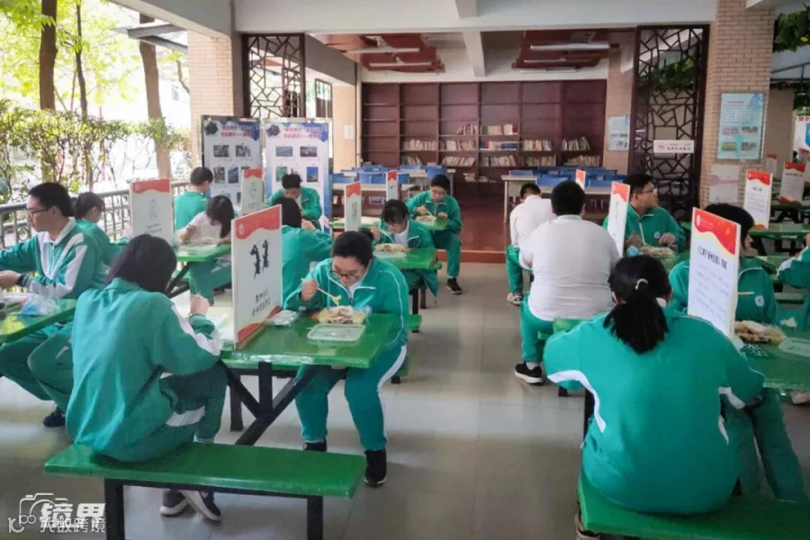 广州113中学的食堂里,学生们隔开落座吃饭,饭桌中间新增了一块写有古诗词的隔板。▼