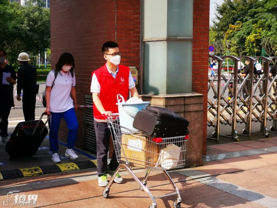 佛山南海华南师范大学高中部,学校发动全体党员及青年教师志愿者80余人,并且租了60辆超市购物车帮学生运送行李。(摄影/陈财)▼