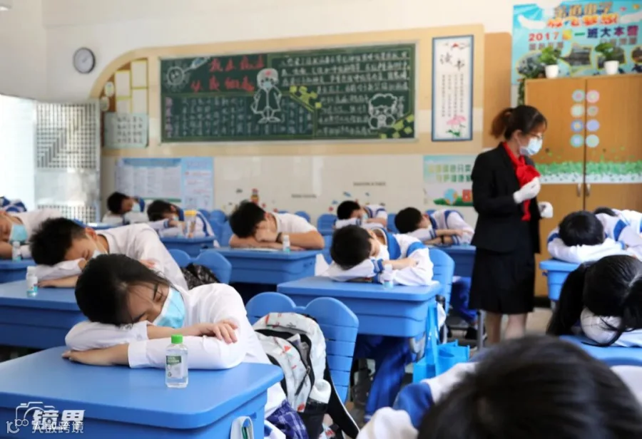 广州荔湾金道中学的学生在座位进行午休。学生被要求脸朝向同一侧,避免鼻息落到隔壁同学脸上。(摄影/吴伟洪)▼