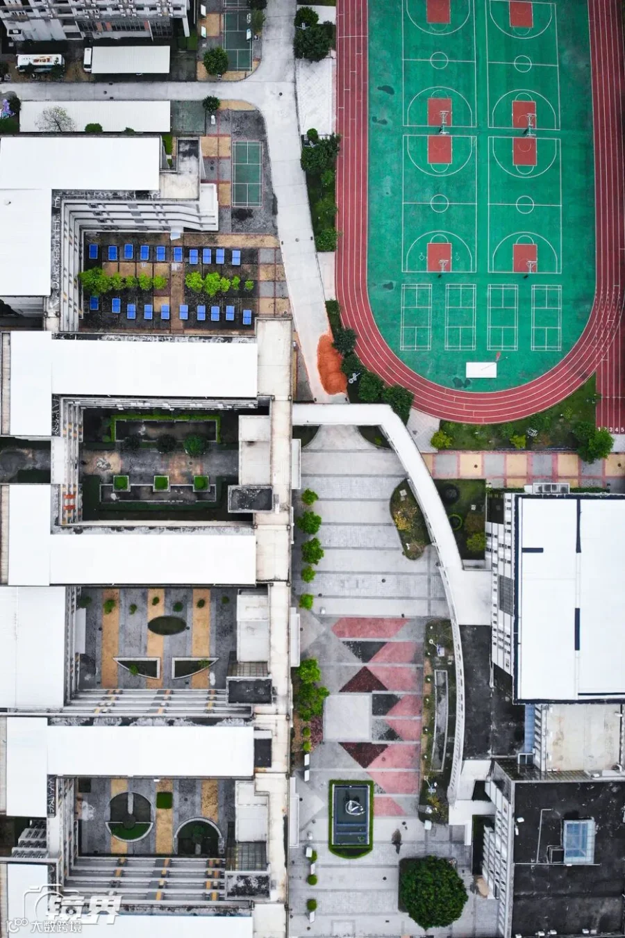 ▲疫情期间,广东各地学校均被临时关闭。图为4月8日广州白云中学金沙洲校区航拍,校园里空无一人。