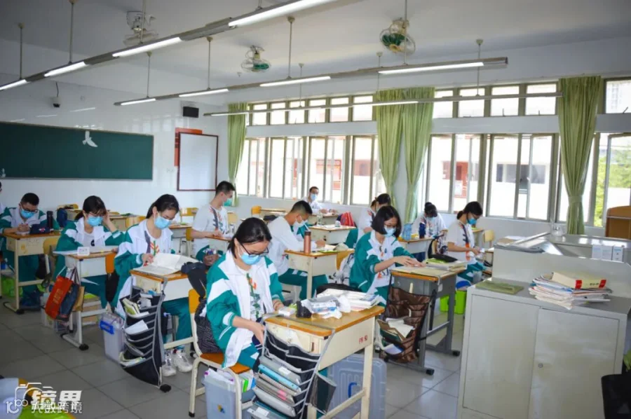 广州113中学,学生戴着口罩准备上课,其他同学将在另外的教室自习上课或自习。▼