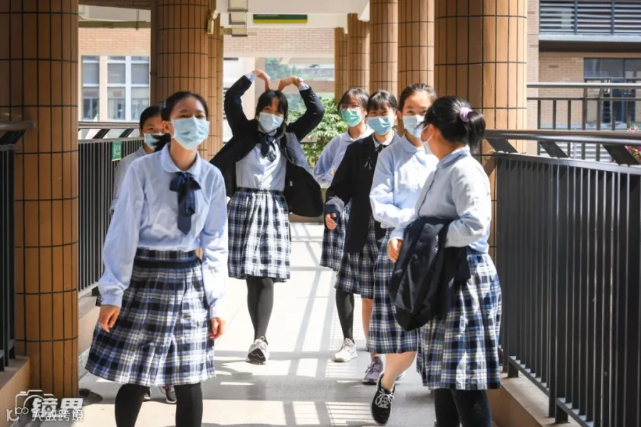课间休息时,深圳外国语学校初三的女生们在楼道里笑着对镜头摆pose,和煦的阳光打在她们脸上。(摄影/梁旭)▼
