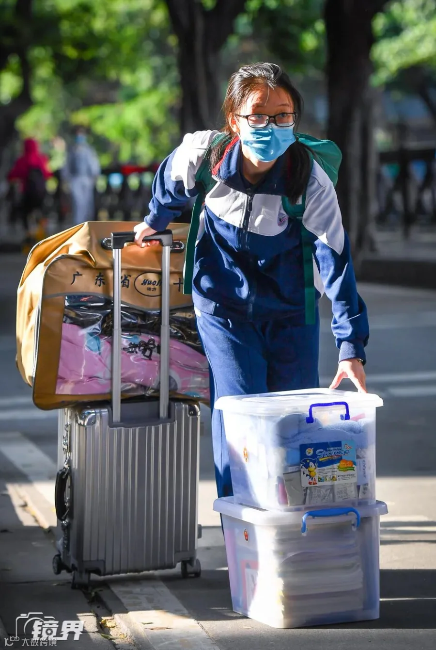 ▲ 4月27日早晨,广州市铁一中学门口,一名高三学生带着多件行李,目光望着校门。(摄影/刘大伟)