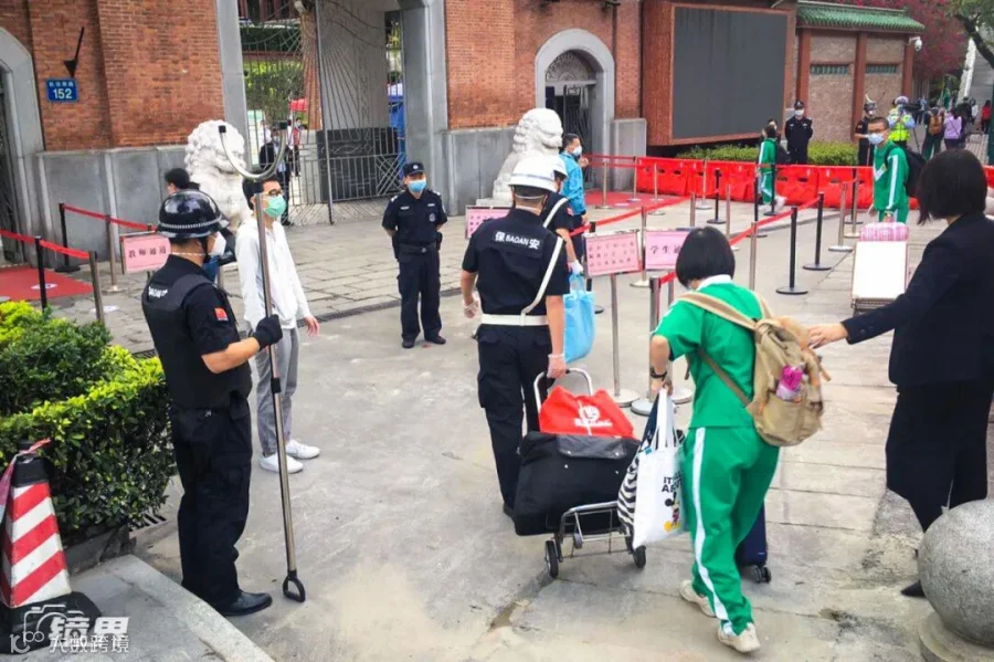 广州执信中学门口“五步一岗”,严格“护航”。图为保安在帮学生拉行李。▼