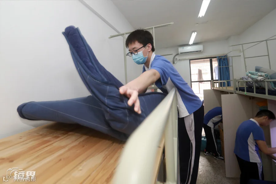 下午时分,深圳市福田区外国语高级中学首批返校的高三学生正在宿舍铺床。(摄影/朱洪波)▼
