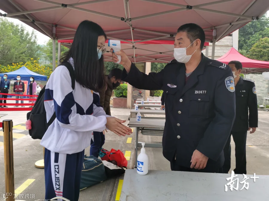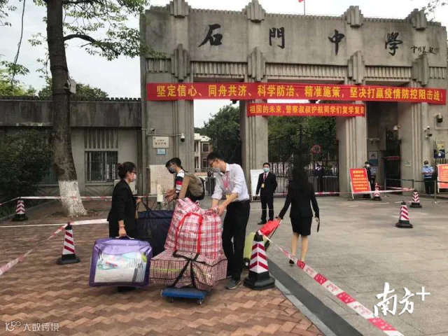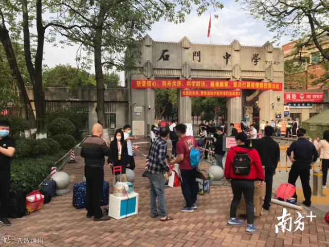 【石门中学】从早上7时开始,石门中学的学生已陆续开始返校,学生排开一米间隔有序进行人脸识别测温,家长一律不得入内,教师志愿者协助返校学生搬行李。