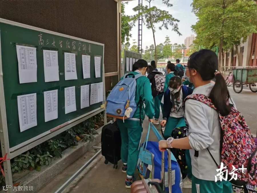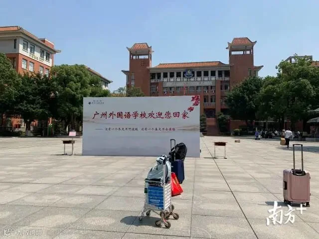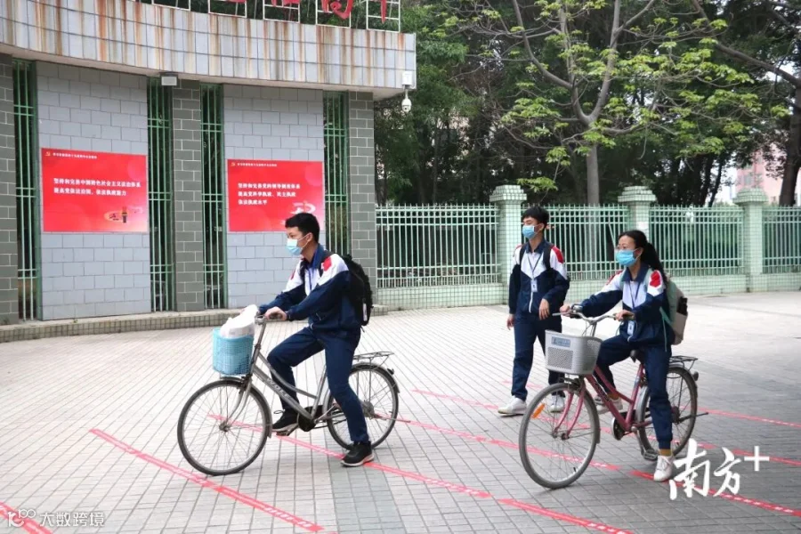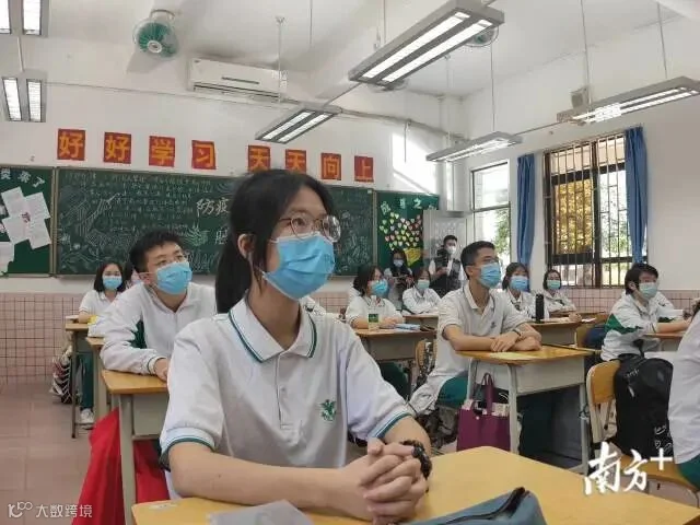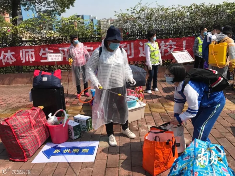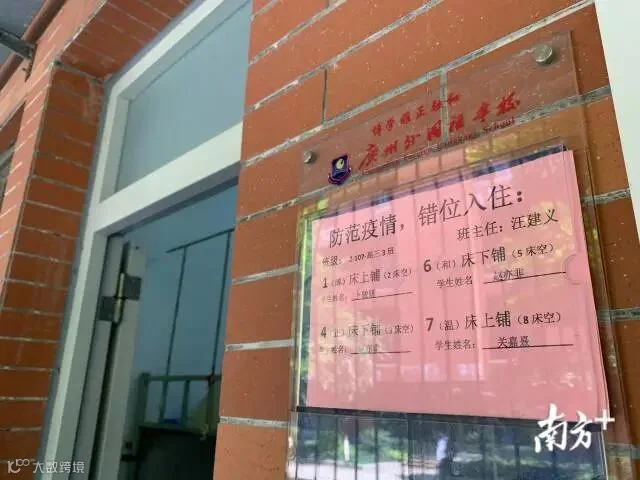【广州外国语学校】广州外国语学校670名学生陆续返校后,进行简短休整,十一点点名,中午回宿舍休息,下午开第一课。据介绍,初三高三共有约670个学生,走读生之前占比不到一成,全部改为住校,减少人员流动。之前50人每班,现在改为每班25人,单人单桌,每天确保通风,每天消杀。