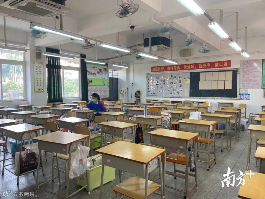 【江门一中】上午学生分流返校、整理内务,班级课室里还没有很多学生。