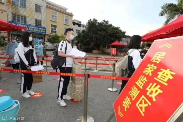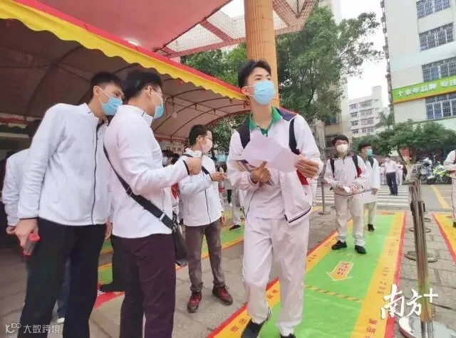【英德市一中】英德市一中门前,学生与家长在等待检测,每人相隔一米。