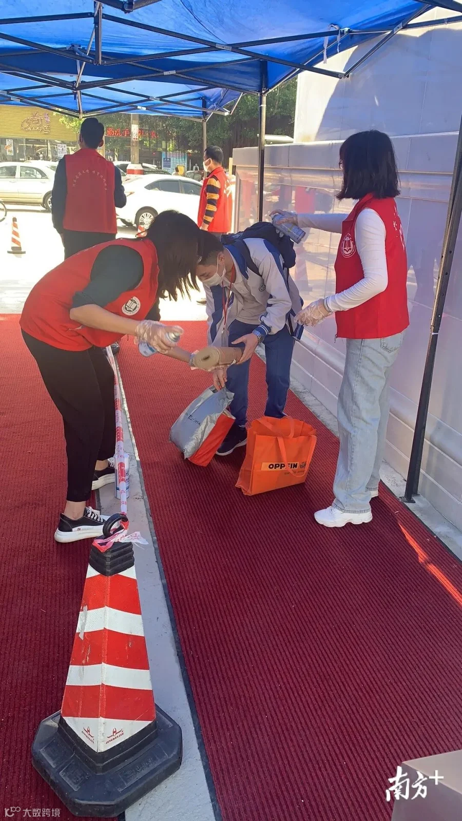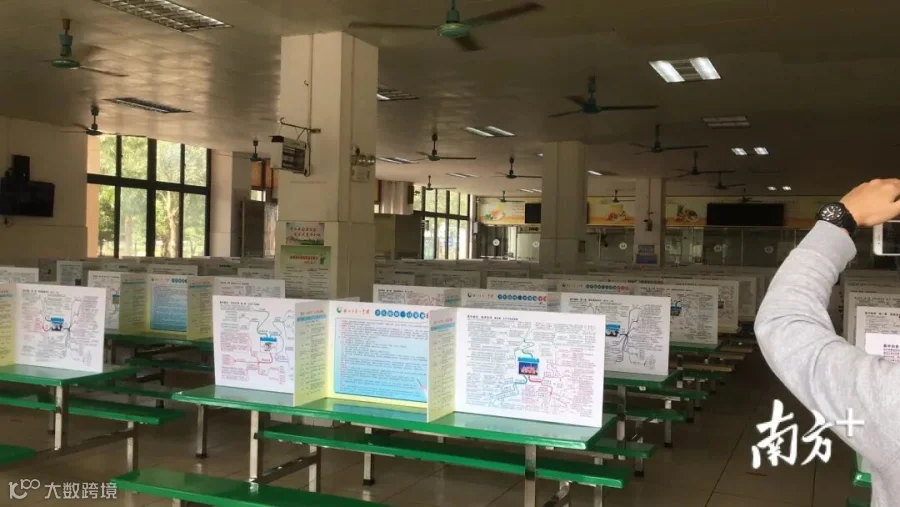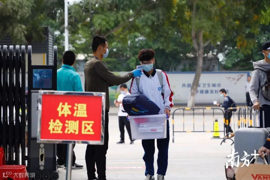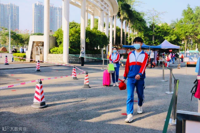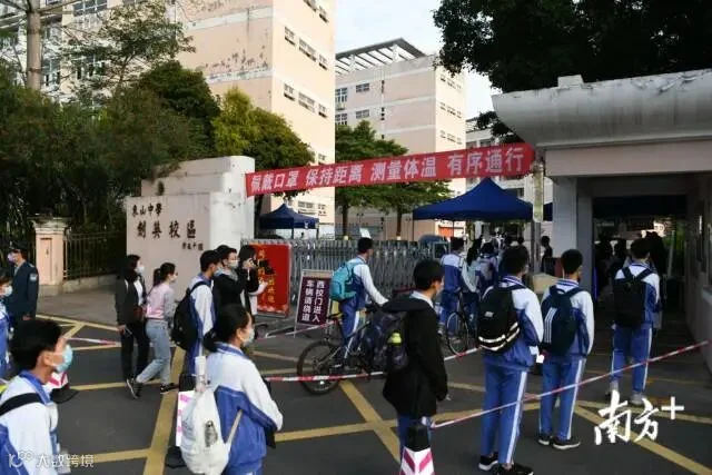 【中山华师附中】华师附中原来有17个班级,一个班级40多位学生,现在班级一分为二,相当于34个小班,每个小班20多人。“时刻戴口罩。快来排队啦。”叶志斌在宿舍收拾好东西后,生活老师过来指导学生之间间隔1米排队去食堂踩点,老师一次带着6个小班。中山华附校门口,工作人员为学生的行李消毒。
