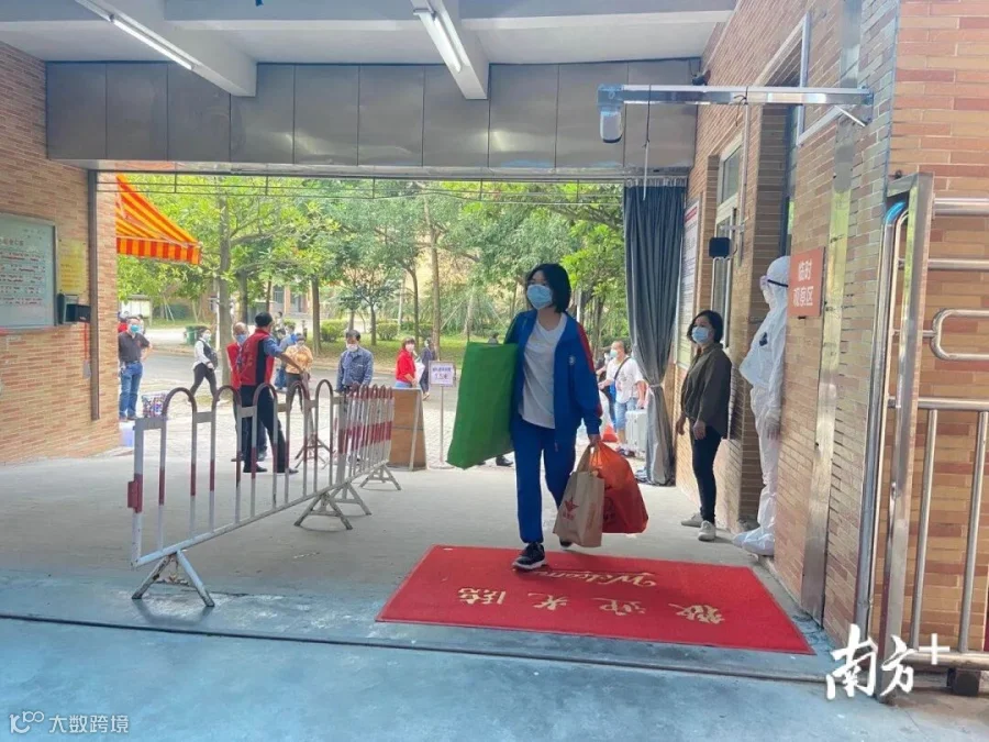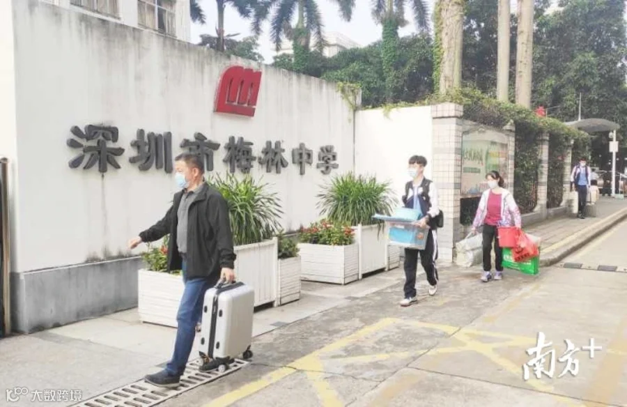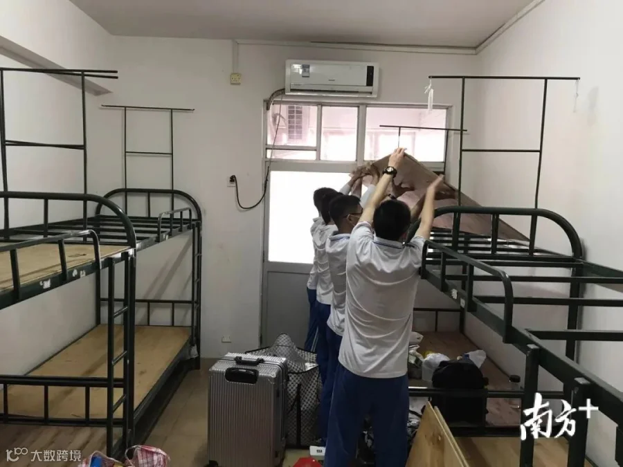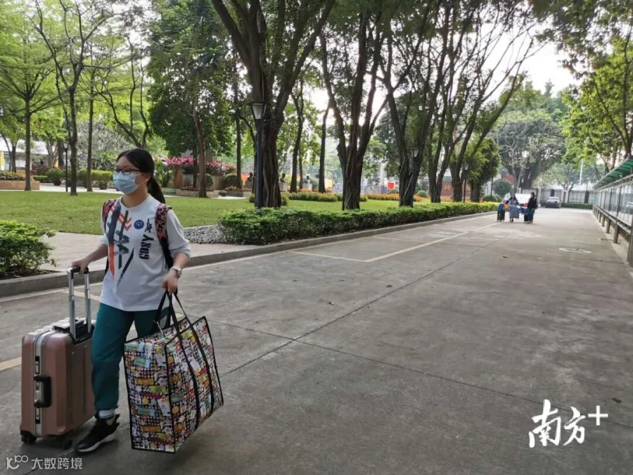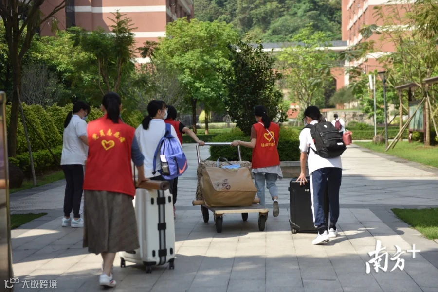 【桂山中学】桂山中学的校门和宿舍距离较远,大部分学生携带了行李箱、大量书籍、被子等生活用品。