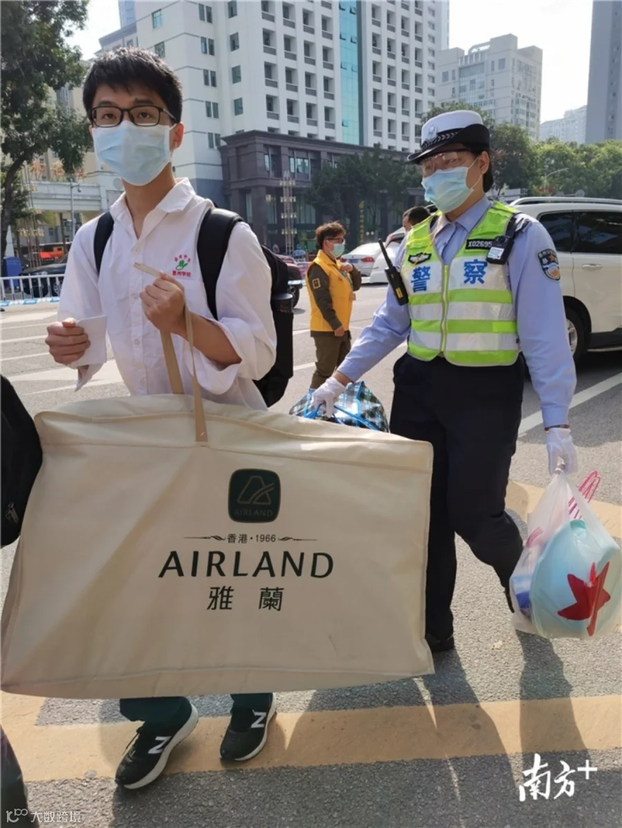 【黄冈中学】在惠州黄冈中学,值勤交警在引导疏通交通之余,还帮助返校学生搬运行李,让其能及时安全进入校园。