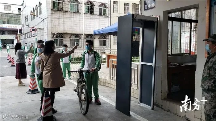 【龙门县实验学校】在龙门县实验学校,学生们在老师的指引下有序进入校园。该校在门口安装了红外线测温仪,正常体温下通过时亮绿灯。如体温超出正常范围,则会亮红灯示警。