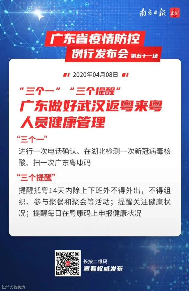 “从今天起,武汉市解除了离汉离鄂通道管控措施。据统计,约有10万人将从武汉陆续返粤,‘内防反弹’的风险增加。”周紫霄表示,为严控输入风险,我省采取了“三个一”和“三个提醒”的措施,强化社区管理和用人单位主体责任,全方位做好武汉返粤来粤人员的健康管理。
