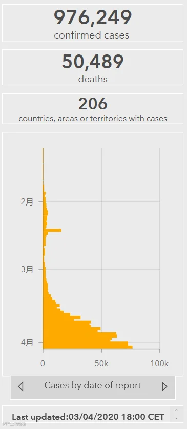 世卫组织实时统计数据显示,截至欧洲中部时间4月3日18时(北京时间4月4日0时),全球确诊新冠肺炎976249例,死亡50489例,目前全球已有206个国家和地区出现新冠肺炎病例,中国以外超过89万例。