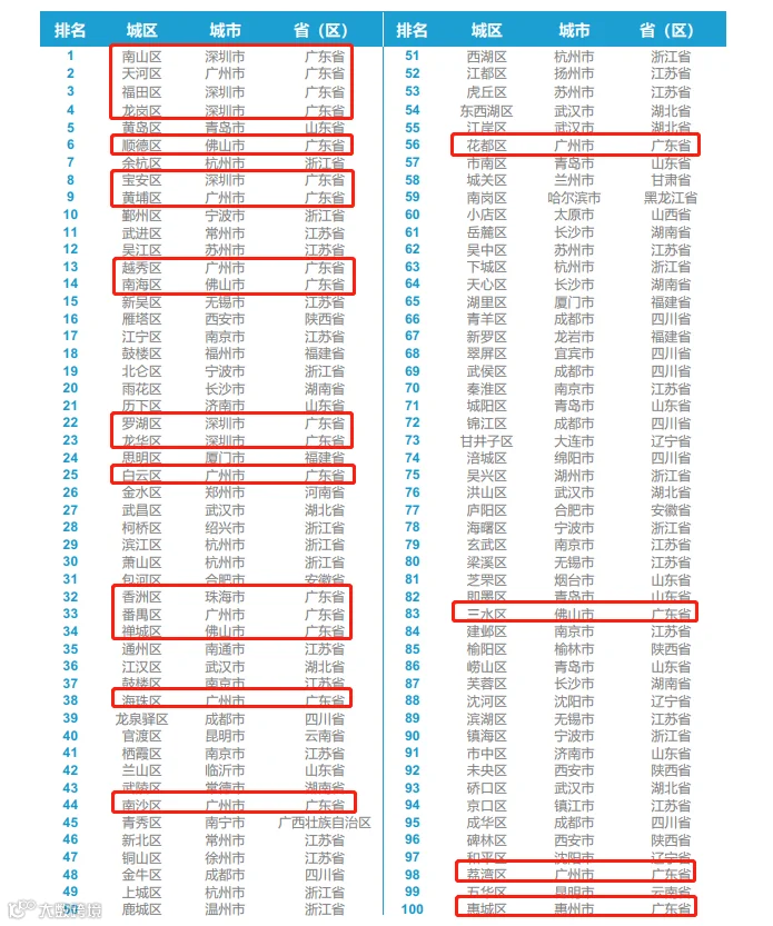 值得注意的是,广东省在百强区排名中最为突出:全省有21个城区上榜,前十名中广东一省包揽七席。