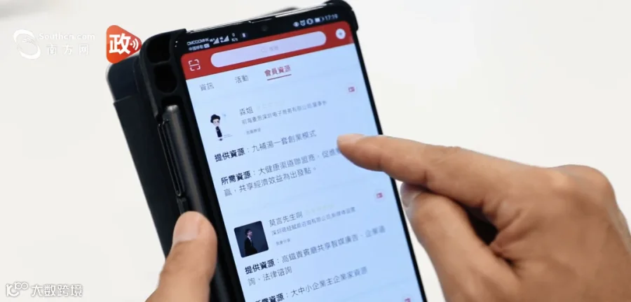 洪纬向记者展示焱信为民app。在app上,用户可以建立不同的社群圈子,共享人脉资源。