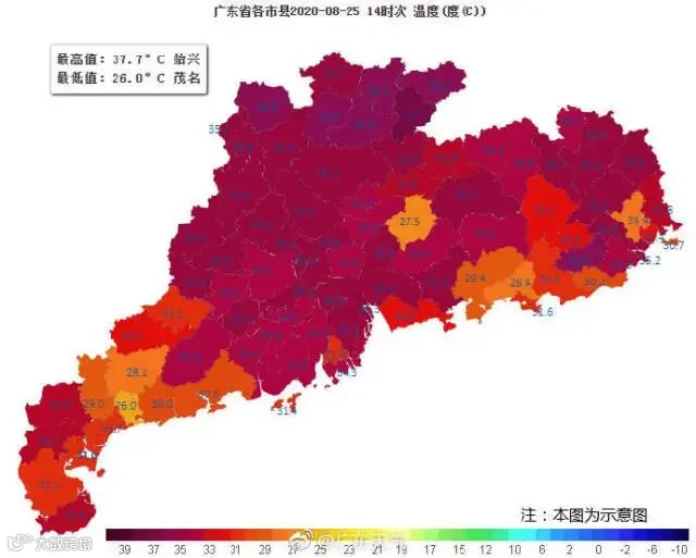 所以,今天14时,整个广东又烤到焦红。如始兴37.7℃、连州36.9℃、曲江36.6℃、普宁36.4℃、乳源36.3℃、仁化36.2℃、南雄36.1℃、阳山35.9℃、连南35.8℃、乐昌35.7℃。